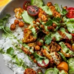 A delicious and hearty plant-based dish featuring roasted cauliflower, crispy chickpeas, and fluffy basmati rice drizzled with a creamy tahini sauce.