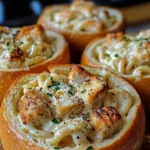 Indulgent Chicken Alfredo served in a crispy garlic bread bowl, perfect for cozy dinners or casual gatherings.