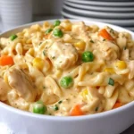 There’s something wonderfully nostalgic about the smell of a pot pie bubbling in the oven — warm, buttery crust, savory chicken, and a creamy, herb-kissed filling. Imagine that same cozy aroma but twirled through ribboned pasta: tender noodles wrapped in a velvety cream sauce, juicy shreds of chicken, pockets of sweet peas, and soft vegetables that still have bite. Each forkful is an orchestra of textures — the creaminess of heavy cream balanced by the slight snap of carrots and celery, the comfort of roasted chicken, and the subtle lift of thyme.