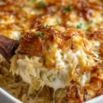 A warm, comforting casserole filled with caramelized onions, savory chicken, and gooey cheese, perfect for gatherings or cozy nights.