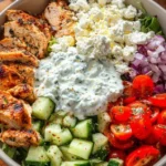This Greek Chicken Bowl is more than a meal — it’s comfort with a Mediterranean twist. It’s perfect for quick weeknight dinners when you want something satisfying but light, for meal-prep lunches that stay vibrant through the week, and for casual gatherings where everyone can customize their own bowl. It’s equally at home on a sunny picnic table as it is on a cozy dinner night in.