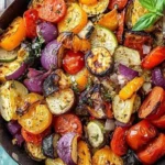 A vibrant mix of roasted zucchini, eggplant, and bell peppers seasoned with garlic and oregano, making a perfect side dish.