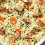 Imagine a warm, steamy pot when you lift the lid: tender, golden-edged chicken nestled in pillowy grains of rice, dotted with sweet orange carrot coins and bright flecks of parsley. The aroma is savory and homey — a whisper of garlic, a touch of thyme, and the reassuring scent of chicken broth — that feeling of coming home on a chilly evening. Each spoonful combines creamy rice, juicy pieces of chicken, and just enough texture from the vegetables to keep every bite interesting.