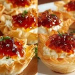 Simple pleasures with maximum payoff. These bites pair irresistibly contrasting textures — flaky phyllo and silky cream cheese — with the lively, sweet-heat of red pepper jelly. They create quick, shareable moments: a tiny bite that sparks conversation, nostalgia for potluck days, and the satisfaction of offering something homemade with almost no effort. They’re ideal for celebrations (holiday parties, showers), casual gatherings (game night, book club), and even quick appetizers when guests arrive early. If you love bold flavor without fuss, this recipe fits perfectly.