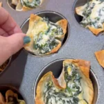 Crispy wonton cups filled with a creamy spinach and artichoke filling, perfect for appetizers or parties.