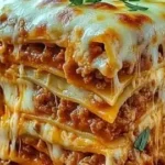 A decadent and comforting lasagna with layers of rich meat sauce, creamy cheese, and perfectly cooked noodles, ideal for gatherings or weeknight dinners.