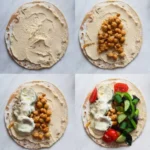 - Assemble each tortilla with hummus, chickpeas, vegetables, and zucchini garlic sauce.